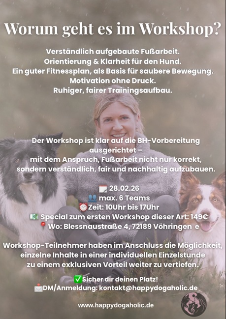 Ob Motivation, Fußarbeit, Tricks oder Dogdance – jedes Team ist individuell und hat seine Stärken und Schwächen. Und genau dort setzen wir an. Feinfühlig, klar strukturiert und mit Spaß am gemeinsamen Lernen.